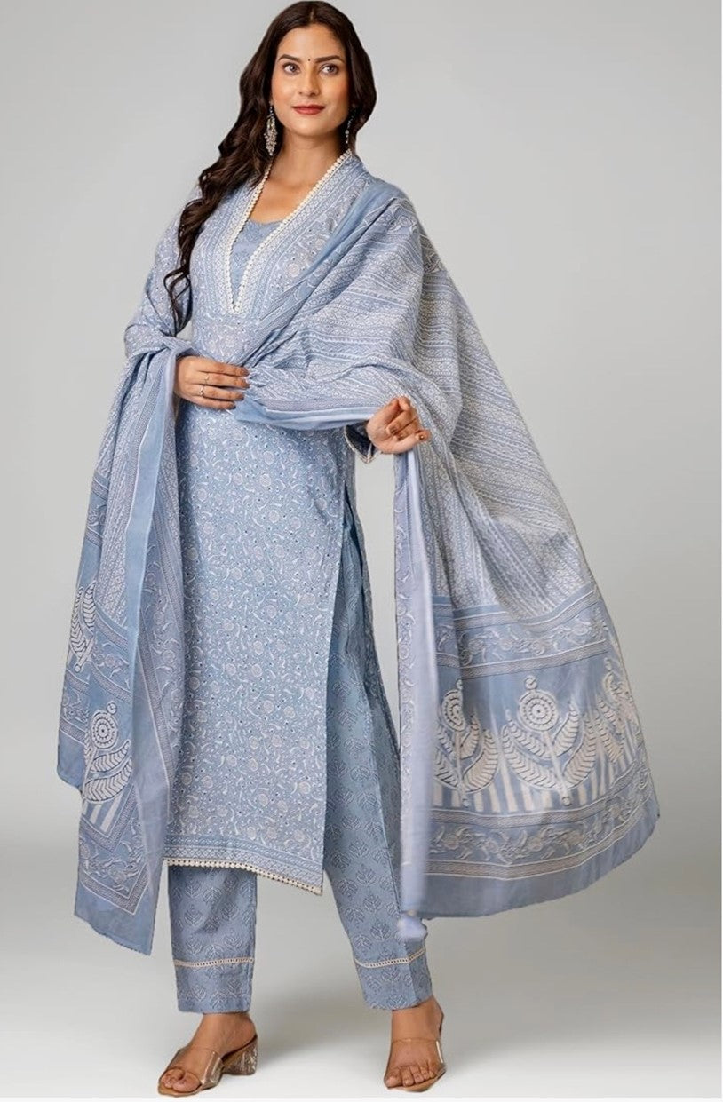 Go Sriki Womens Rayon Blend Straight Printed Kurta with Pant and Dupatta